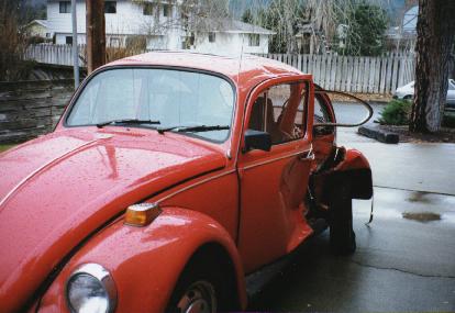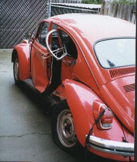 At approximately 9:00 p.m. a terrible thing happened! The little red Bug is squished by a Chevy Astro Van going about 40 m.p.h. The kid is OK. The Bug sustained heavy damage.